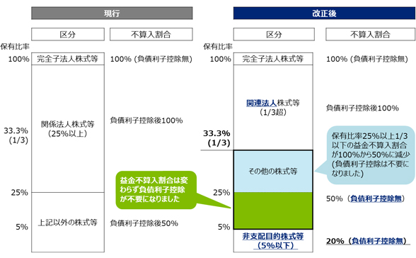 課税ベースの拡大の観点から、受取配当等の益金不算入制度の見直しが行われました。現行の持株比率基準を見直し、持株比率が5%以下は20%、5%超1/3以下は50%、1/3超は100%の益金不算入割合となります。また、持株比率5%超1/3以下のその他の株式等及び持株比率5%以下の被支配目的株式等に係る配当について、負債利子控除の対象から除外されます。このため、負債利子控除の対象は関連法人株式等に限定されることにご留意下さい。